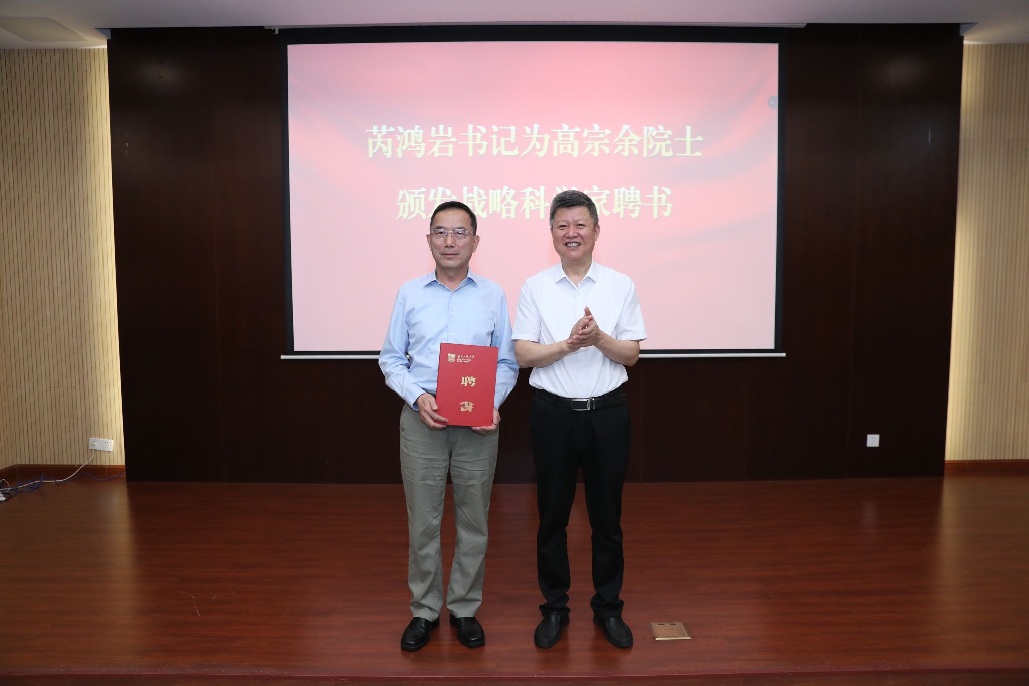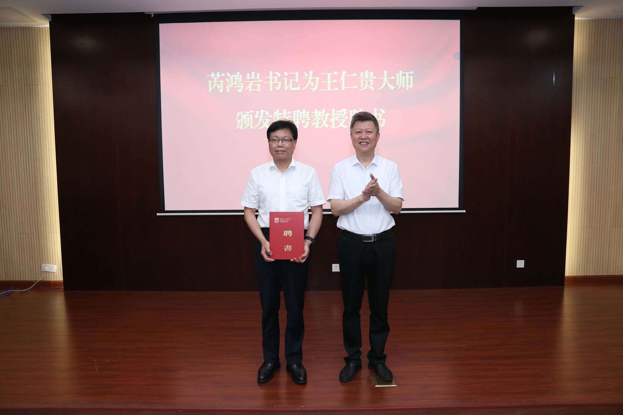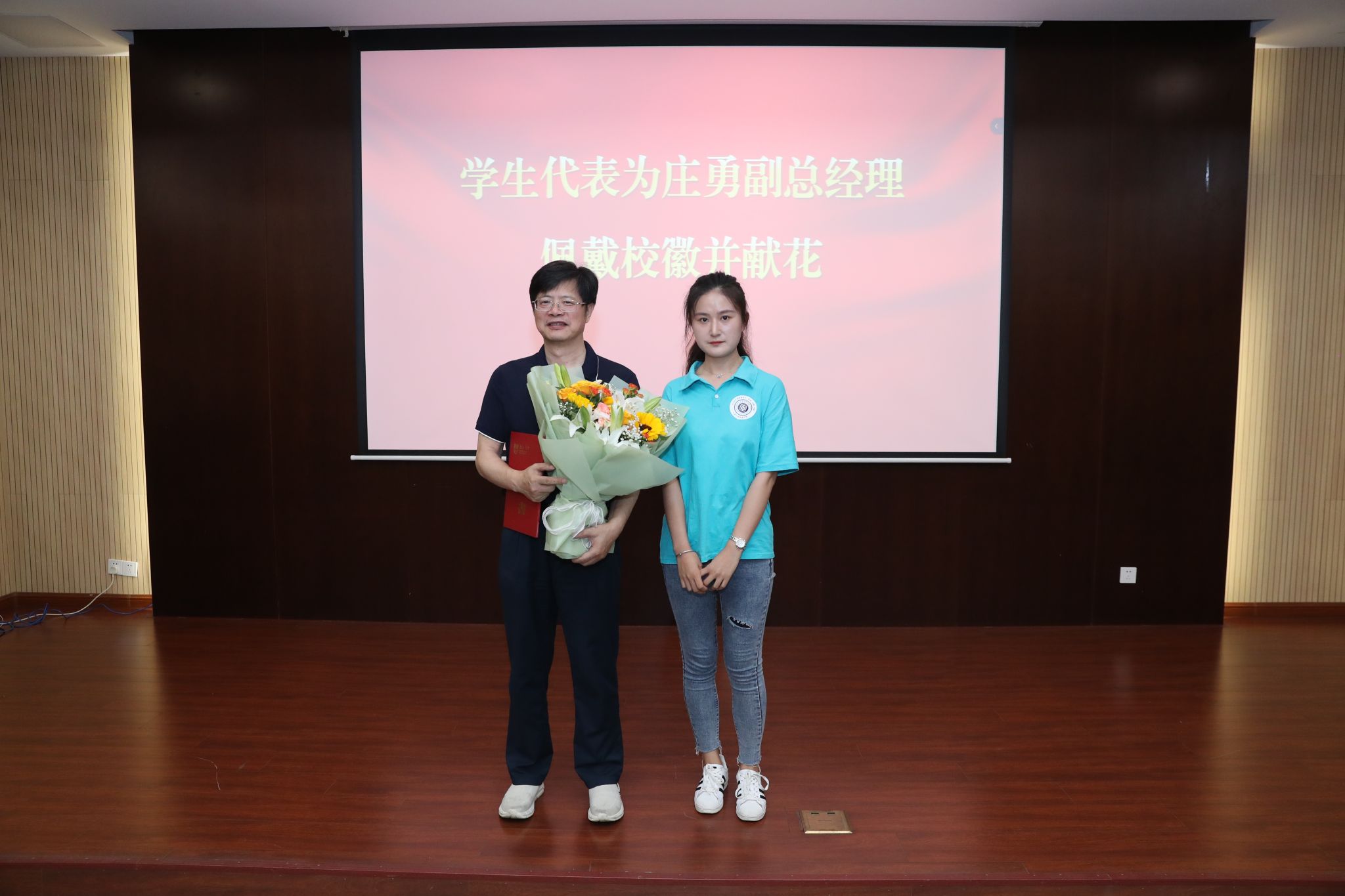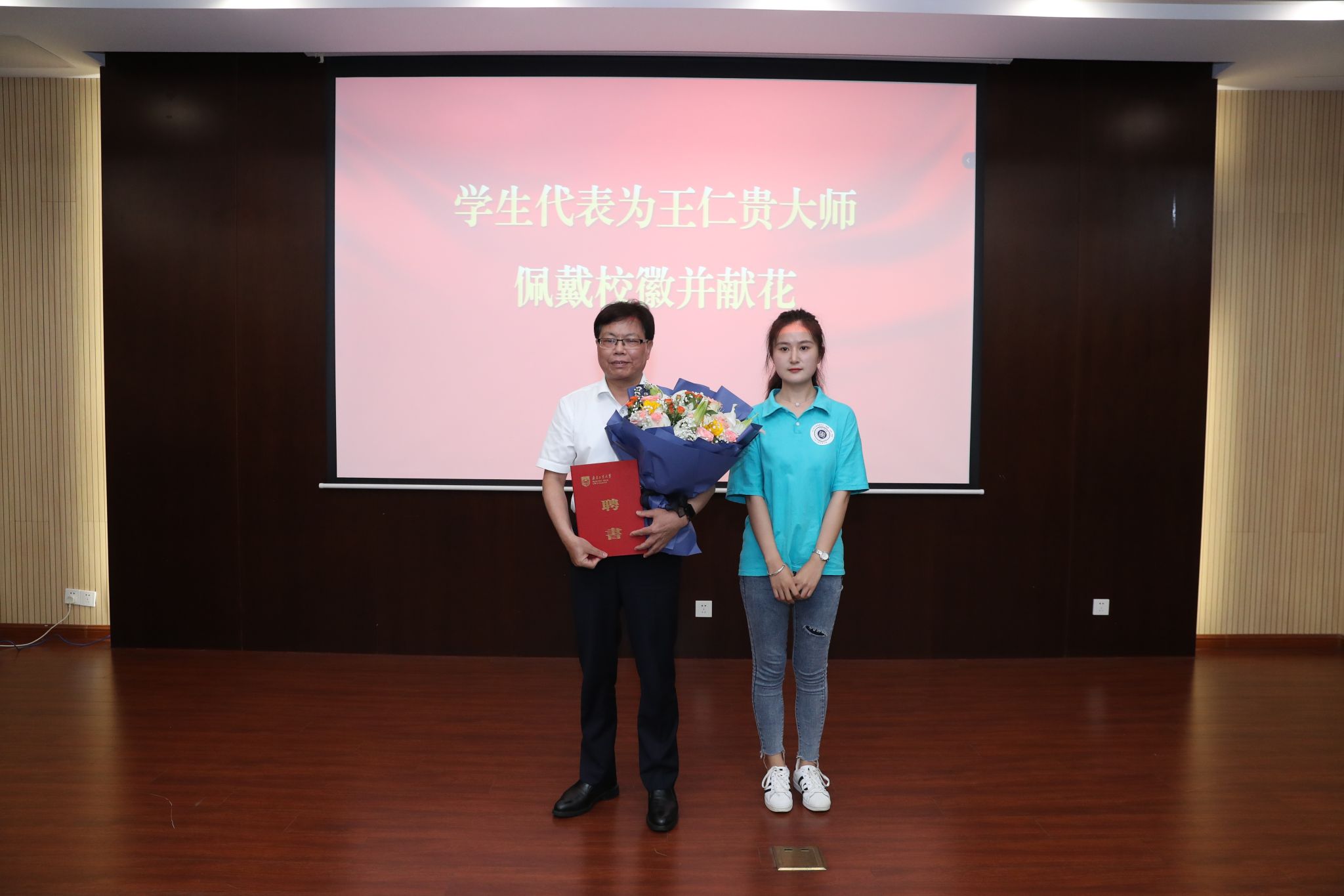 人事处副处长杨洪俊介绍高宗余院士、王仁贵大师、庄勇副总经理的个人简介及主要成就。芮鸿岩书记为高宗余院士颁发战略科学家聘书,为王仁贵大师、庄勇副总经理颁发特聘教授聘书。学生代表为三位专家佩戴校徽并献花。